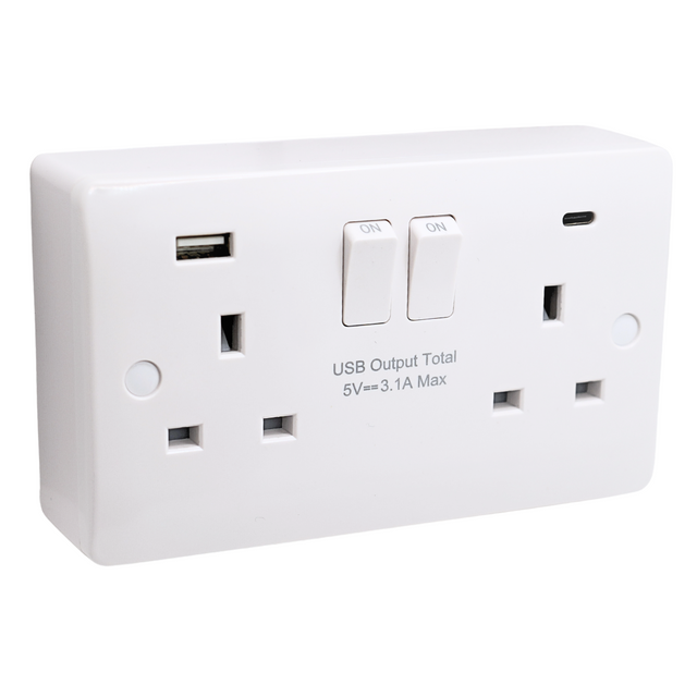 SH|P CONVEX FASTCHARGE Range Curved Edge White 13A 2 Gang Switched Socket with 15W A+C USB Ports and 35mm Surface Mount Back Box